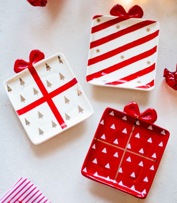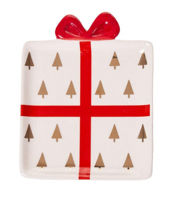 Keraaminen lahjapaketin muotoinen lautanen.