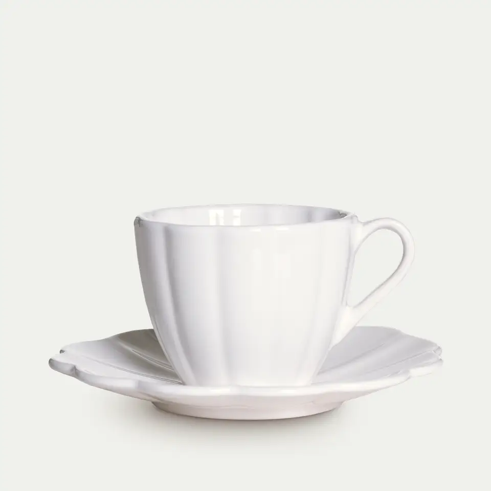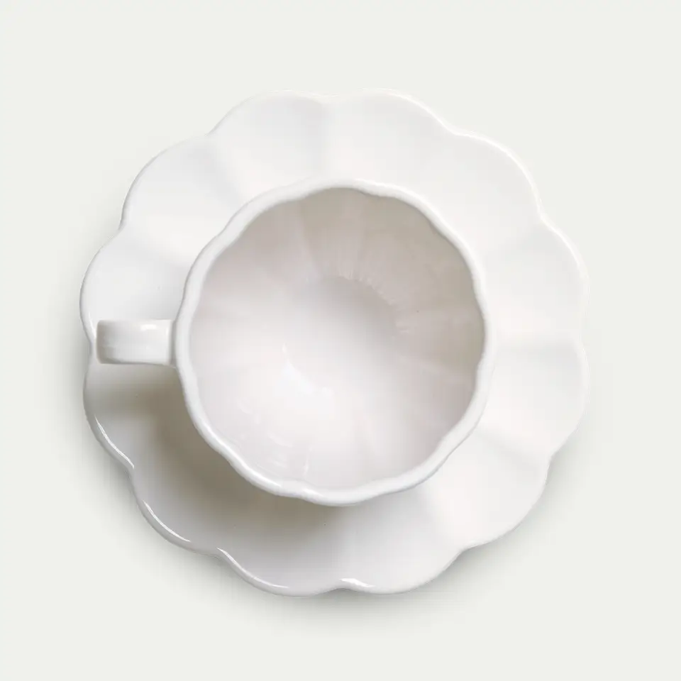 Keraaminen muki ja lautanen lasitetulla pinnalla.