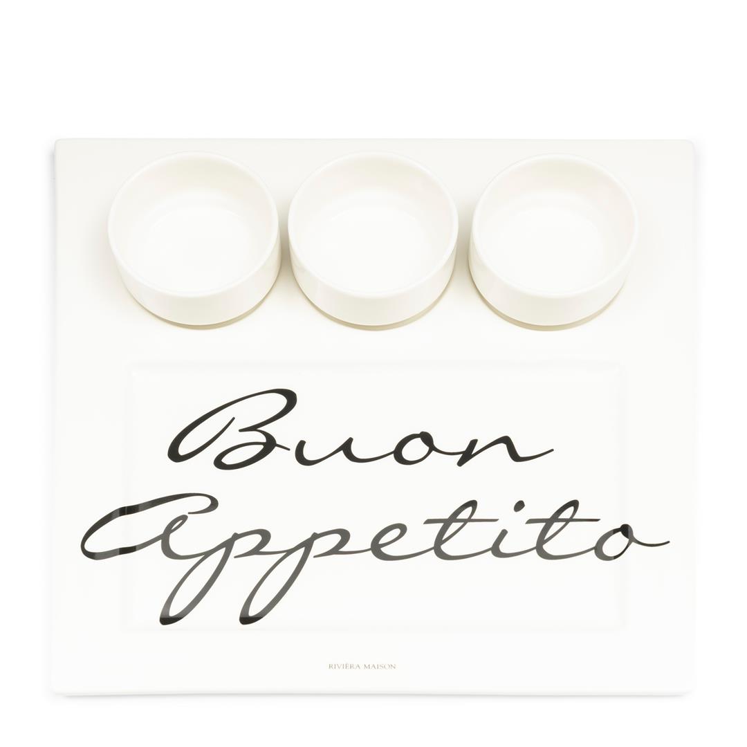 Suurempi tarjoilulautanen sekä kolme pienempää kippoa mm. kastikkeille tai pienimmille tarjoiluille.