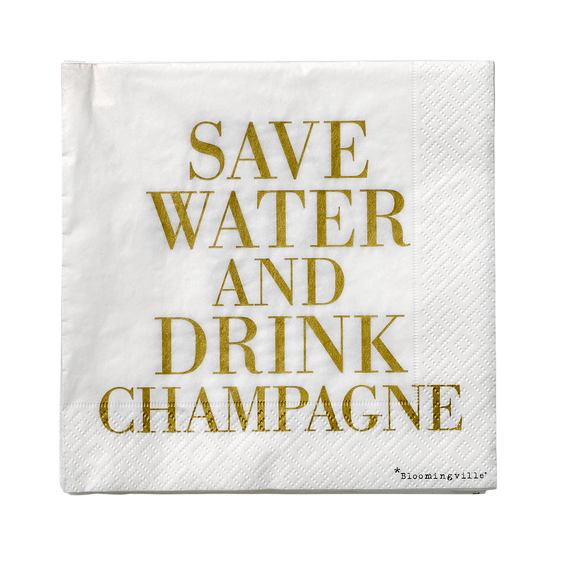 Valkoinen paperilautasliinapakkaus "SAVE WATER DRINK CHAMPAGNE"-tekstillä. Pakkaus sisältää 20 servettiä.