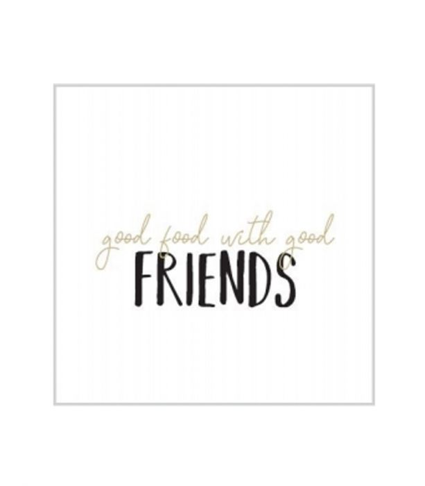 Valkoiset paperiservetit 'good food with good friends'-tekstillä.