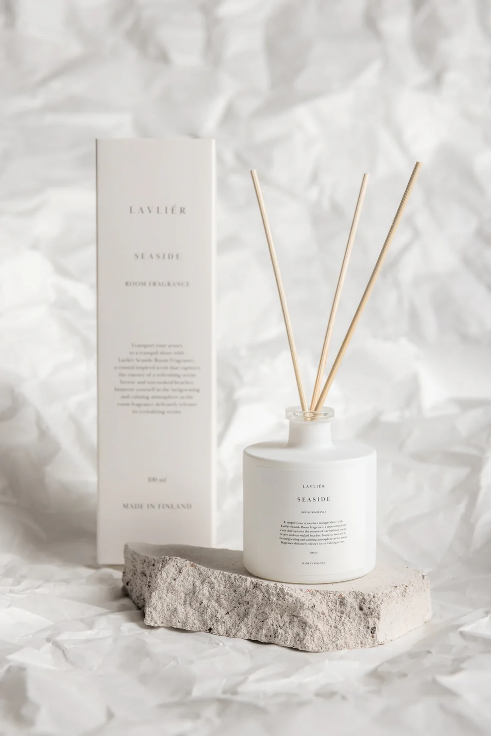 Laadukkaista tuoksuöljyistä valmistettu Lavliér Seaside-huonetuoksu tarjoaa paitsi aromaattisen kokemuksen myös tyylikkään lisän sisustukseen.