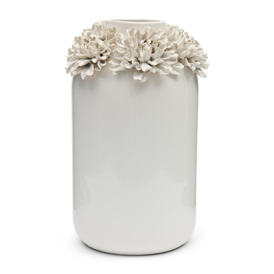 Vaasin yläreuna on peitetty käsinvalmistetuilla keraamisilla kukilla.