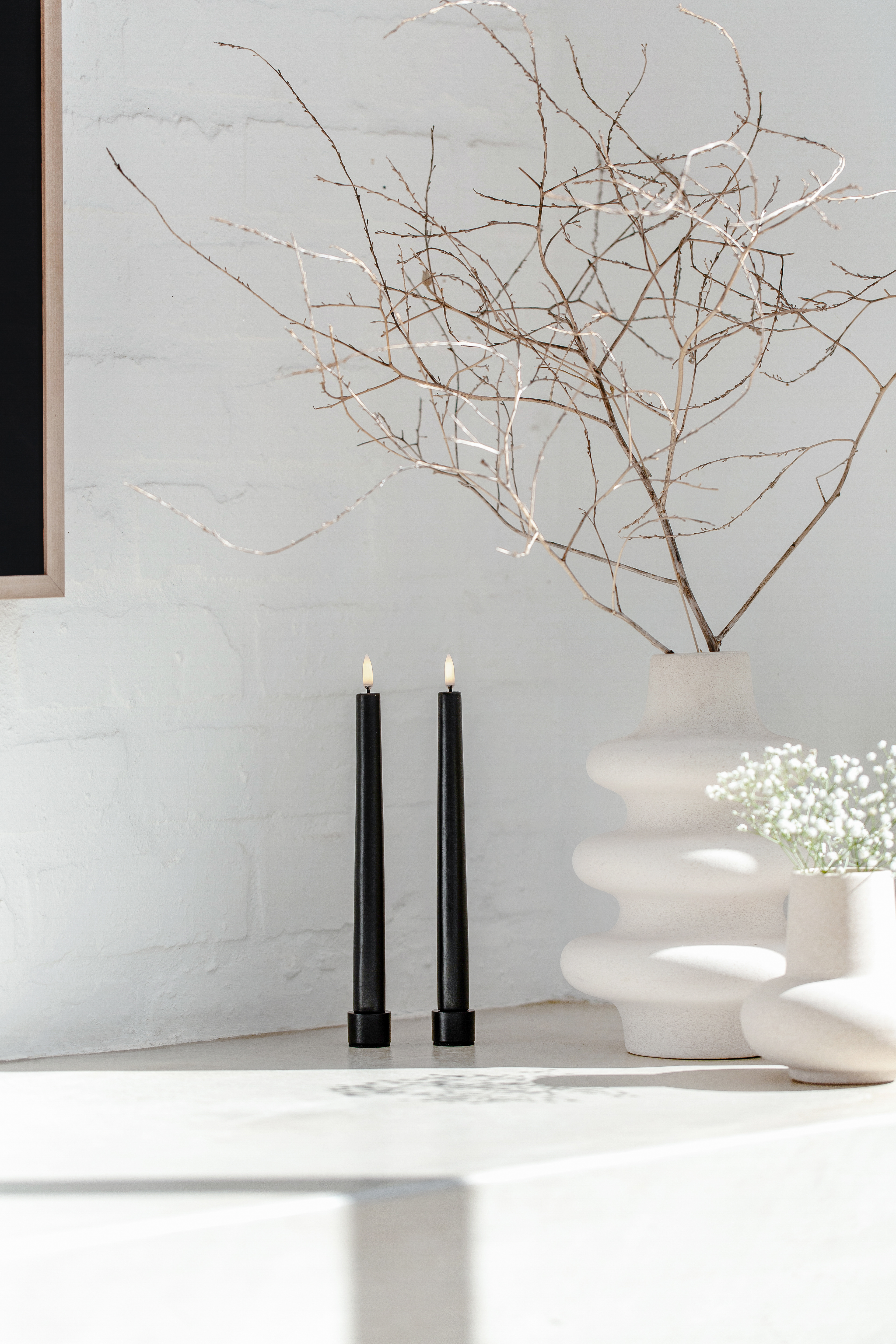 Näyttävä, musta kruunukynttilä LED-liekillä. Liekki on palaessaan erittäin aidonnäköinen ja hohtaa kauniisti kynttilän pinnassa.