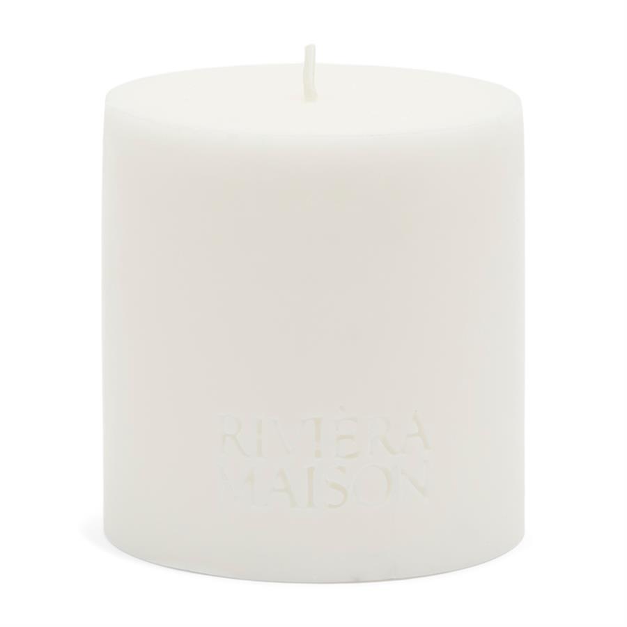 Valkoinen eko-pilarikynttilä. Kyljessä painettuna teksti "Riviera Maison".