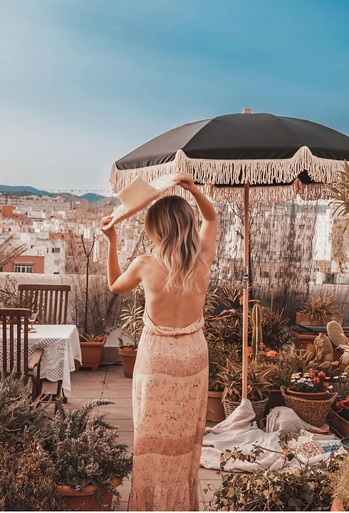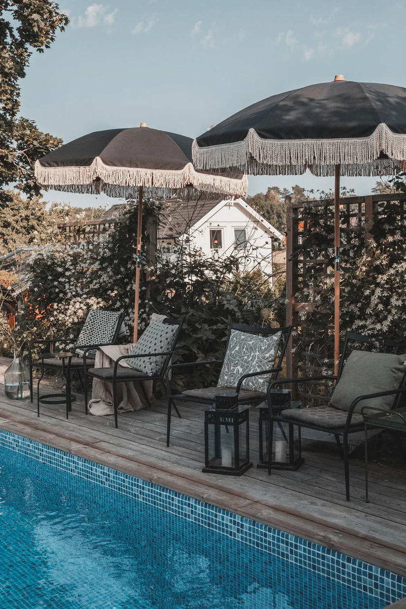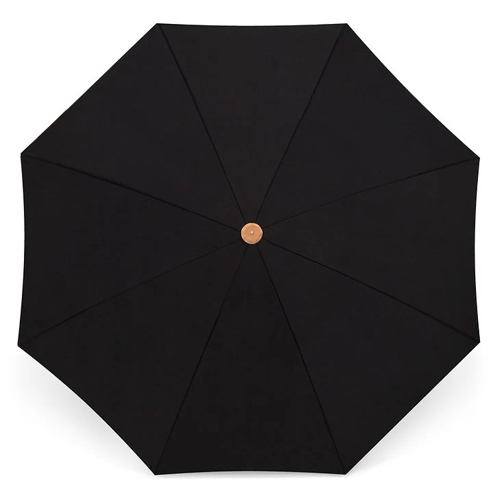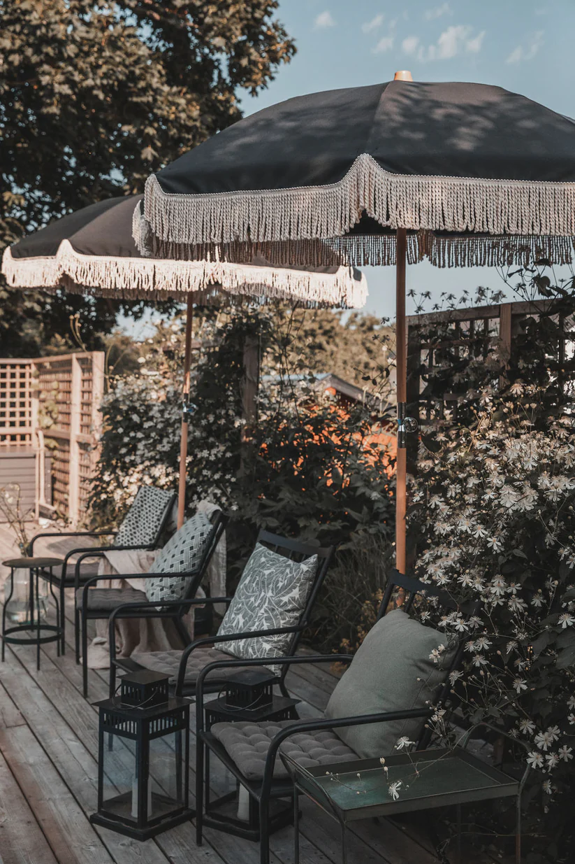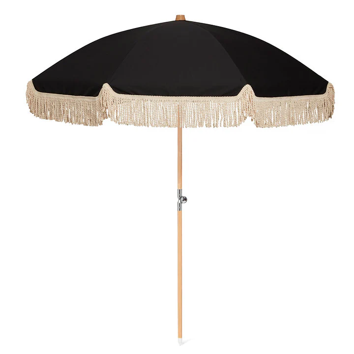 Musta aurinkovarjo vaaleilla puuvillahapsuilla.