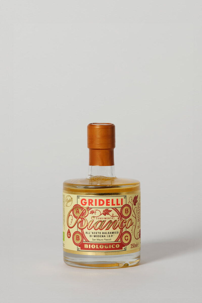Valkoinen luomubalsamico, joka on valmistettu Emilia-Romagnan vihreistä rypäleistä.