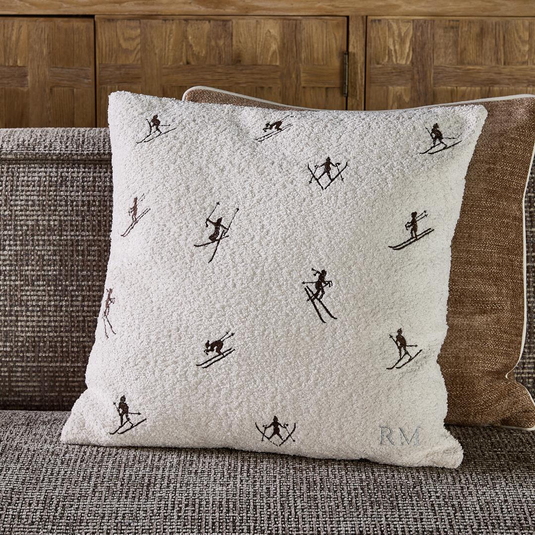 Edessä tyynyssä kirjailtuna lasketteluaiheisia kuvioita sekä RM-logo. Kääntöpuoli tekstiiliä.