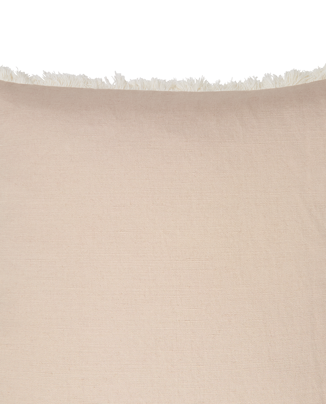 Pehmeä ja rento valkoisilla puuvillahapsuilla koristeltu tyynynpäällinen.