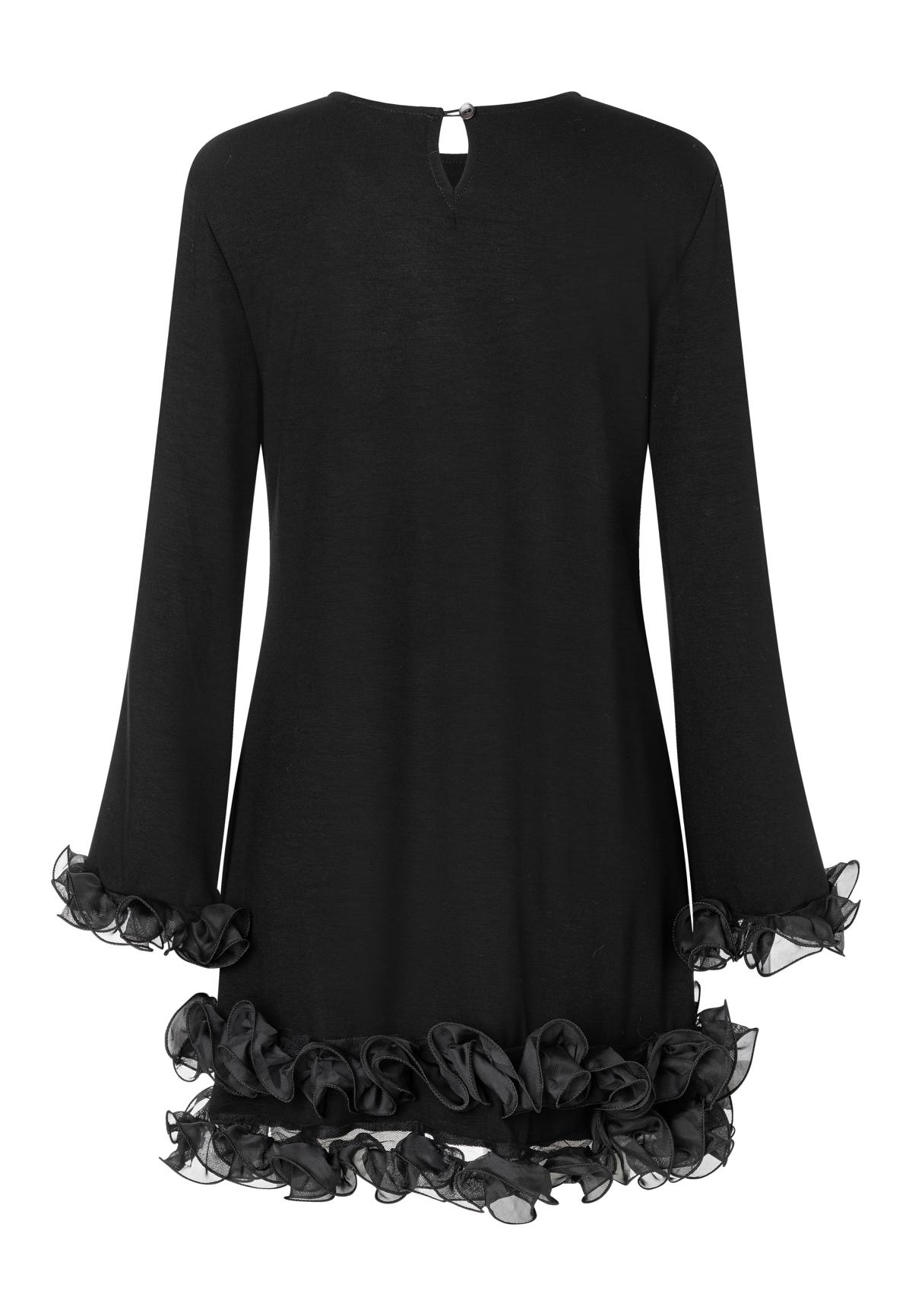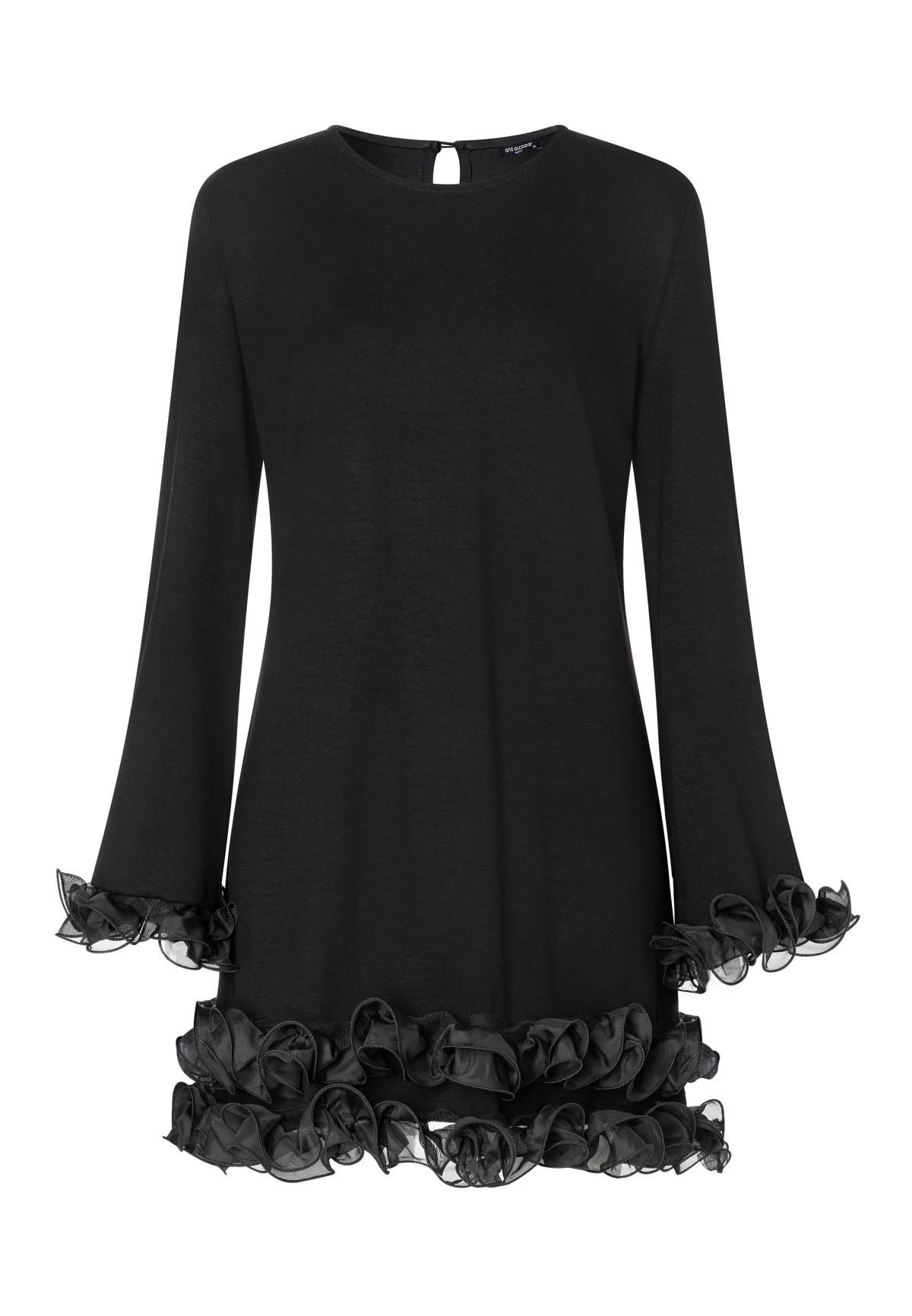 Näyttävä musta mekko röyhelökoristeilla.