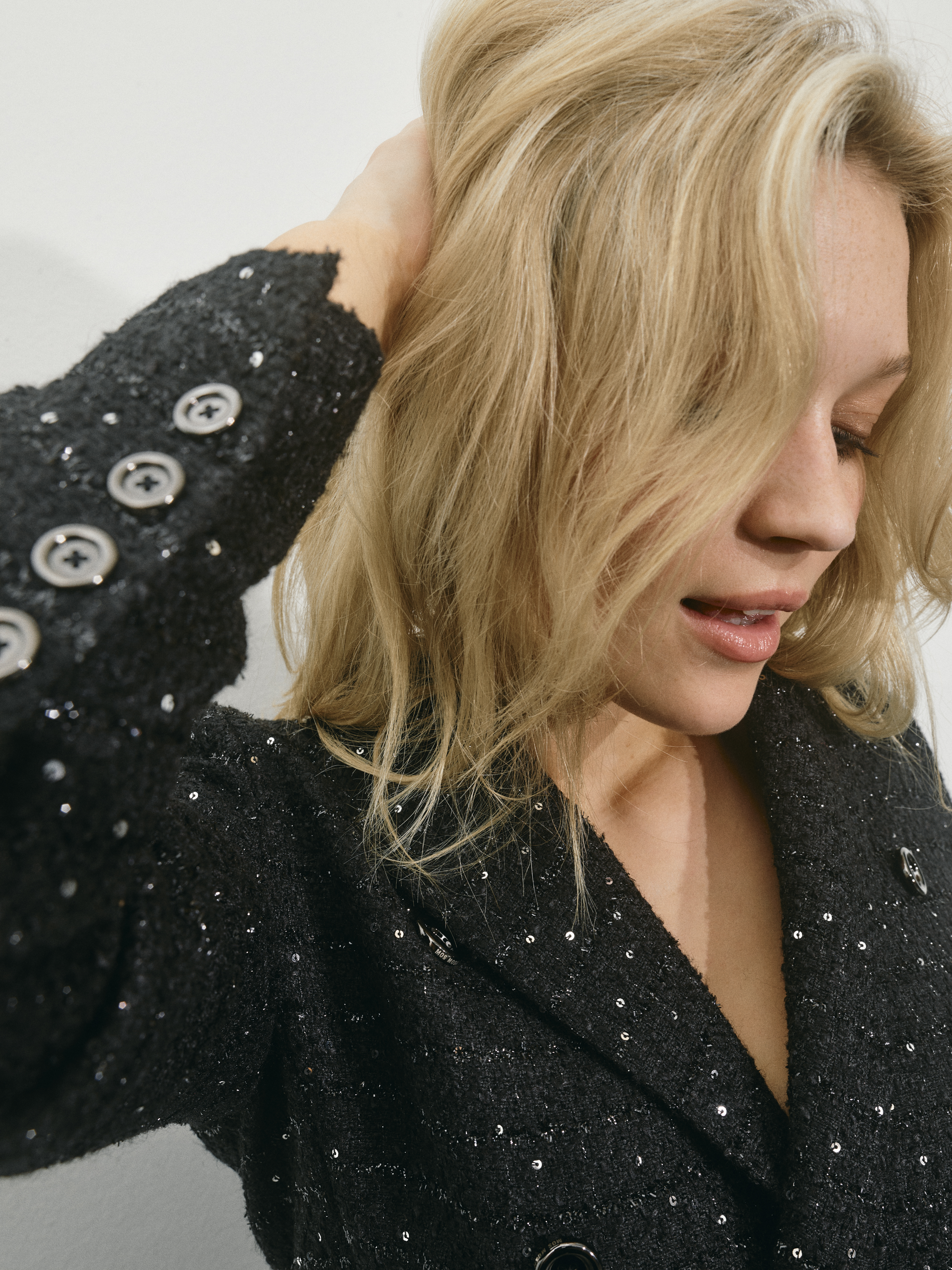Bleiseriä koristaa useat kiiltäväpintaiset napit edessä ja hihansuussa.