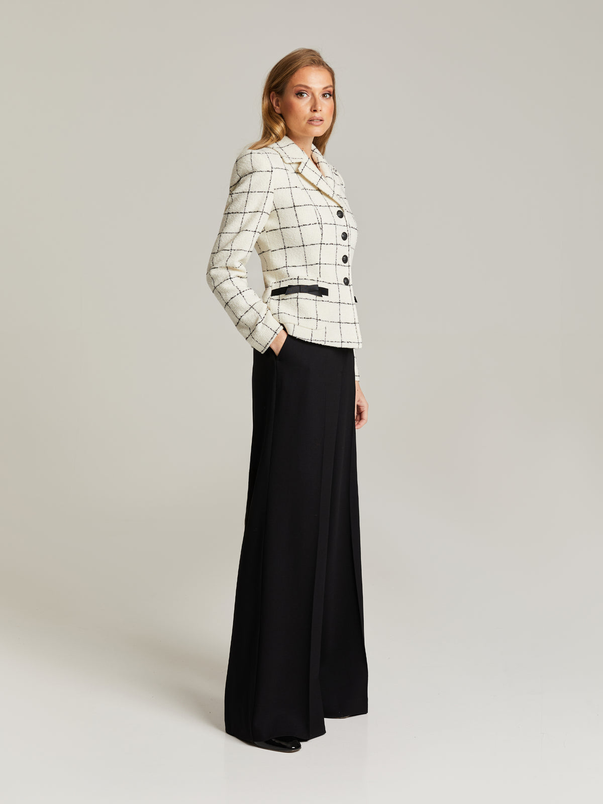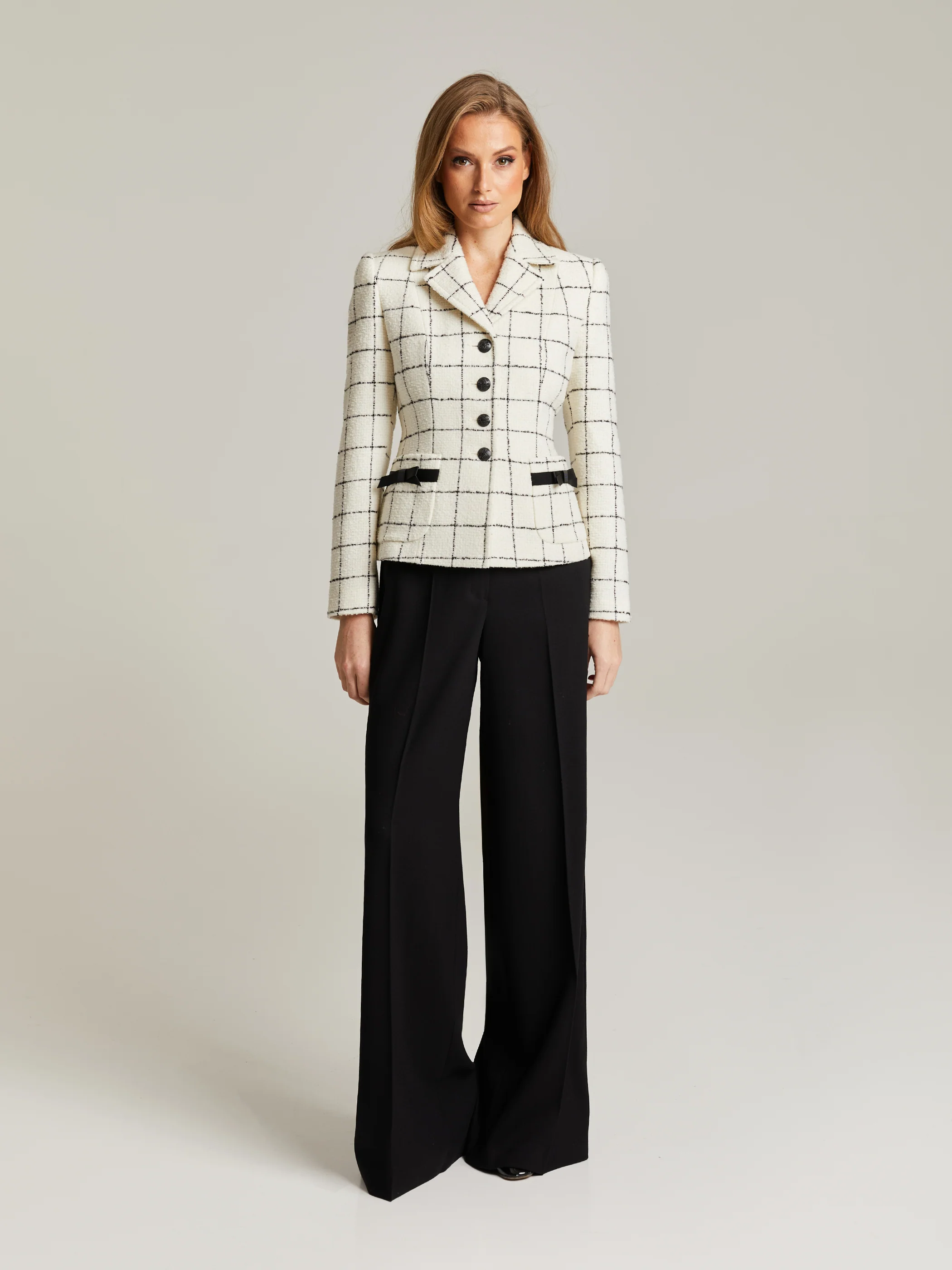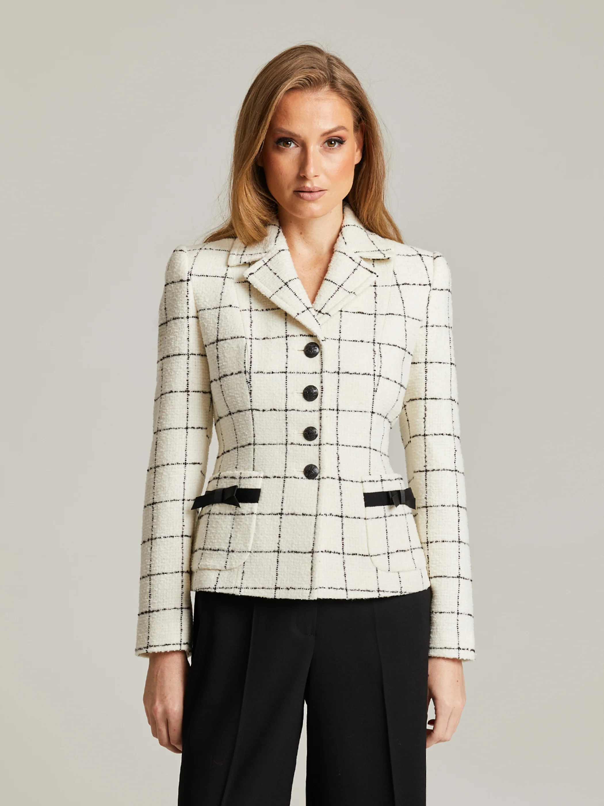 Vaaleapohjainen villajakku ruutukuvioinnilla.