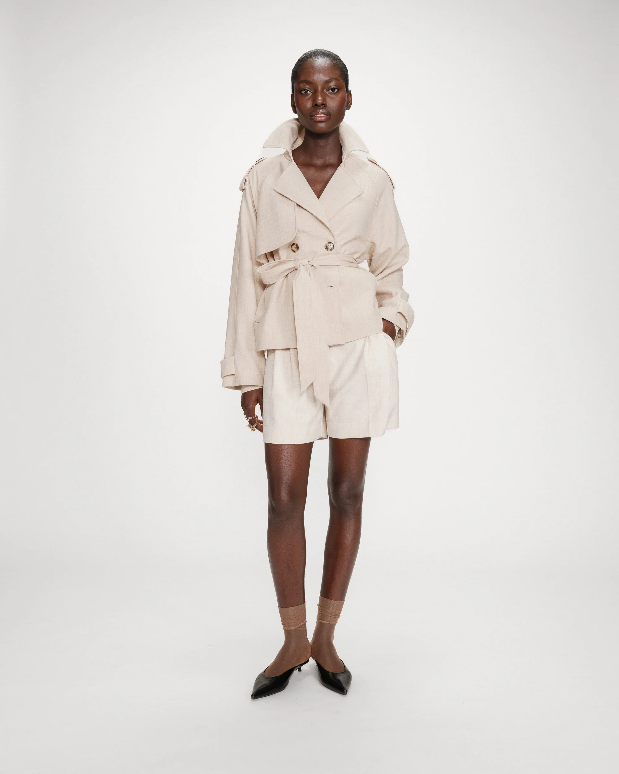 65% polyesteriä, 30% viskoosia, 5% elastaania. Vuori puuvillaa. Kuivapesu.