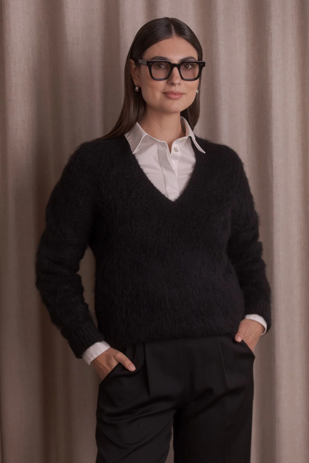 Ajaton pitkähihainen Allia-alpakkasekoiteneule v-pääntiellä yhdistää pehmeyden, lämmön ja keveyden.
