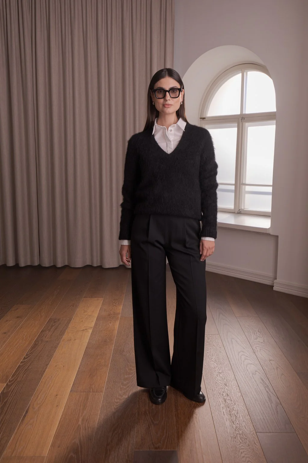 V-pääntie tuo klassista eleganssia ja tekee neuleesta helposti kerrostettavan erilaisiin asukokonaisuuksiin.