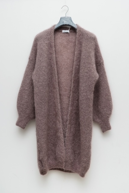 Edestä avoin mohairneuletakki.