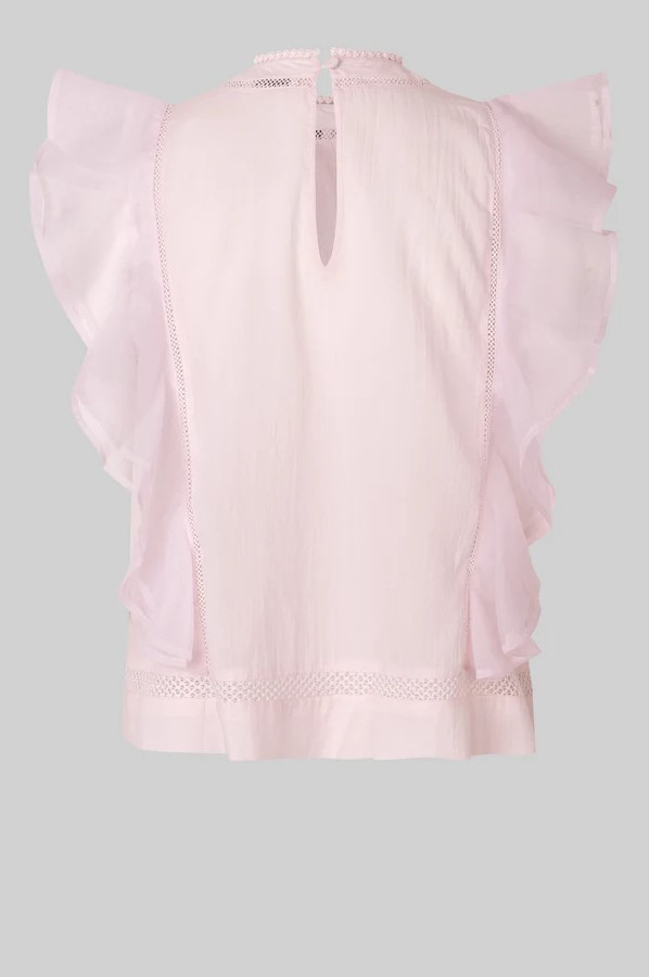 Pusero 100% puuvillaa ja röyhelöt 100% nylonia. Pesu 30-asteessa.