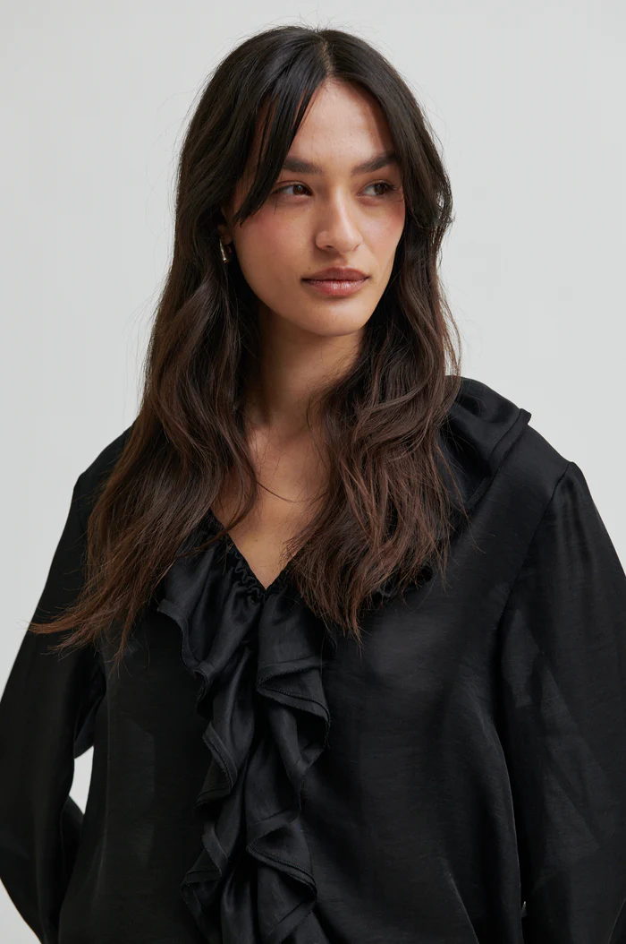 Paidassa näyttävät röyhelöt pääntiessä, edessä ja hihoissa.